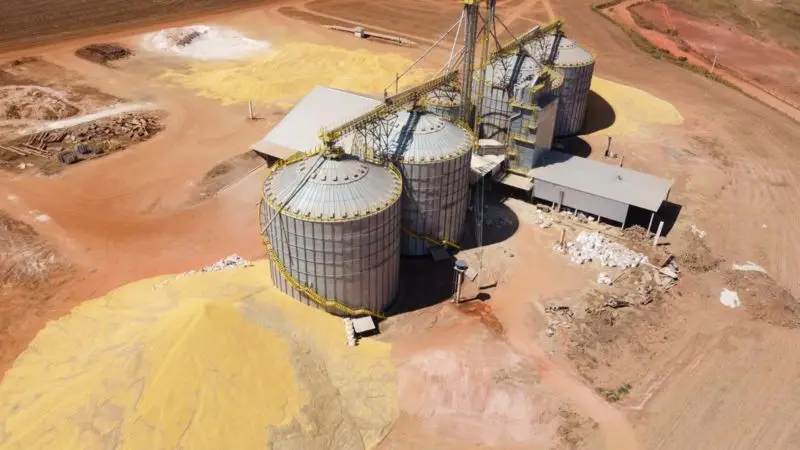 As imagens feitas com um drone impressionam: uma montanha dourada se ergue ao lado de um conjunto de silos gigantescos para armazenagem de grãos.