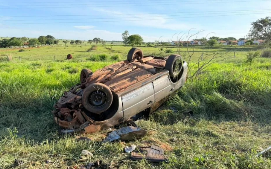 Com o impacto, a picape rodou na pista e parou no meio da via. Já a Parati saiu da rodovia, capotou e parou de rodas para cima às margens da BR-267.