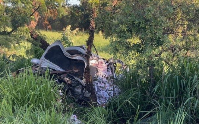 Veículo ficou completamente destruído após sair da rodovia e colidir contra árvores às margens da pista, na região do distrito de Nova Casa Verde. Foto: Divulgação.