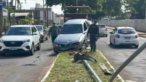 Colisão entre dois carros derruba poste de iluminação pública em MS