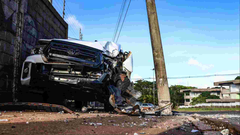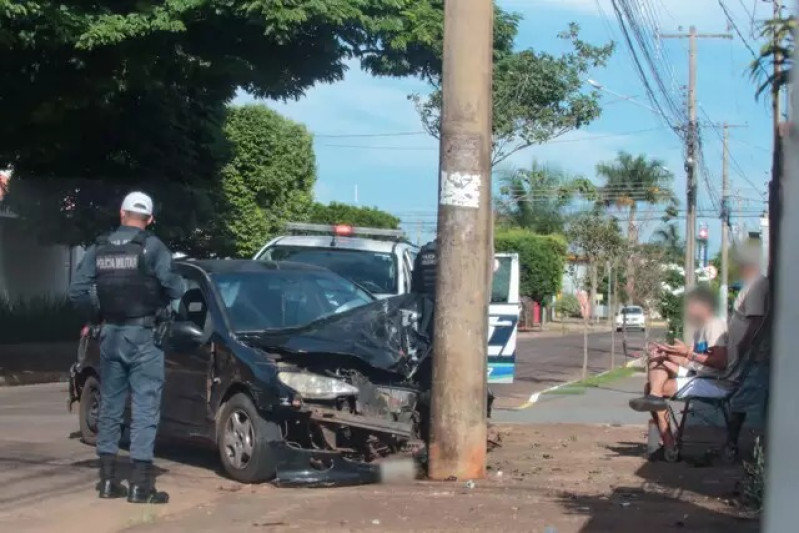 Motorista perde controle, atinge poste e carro tem frente destruída