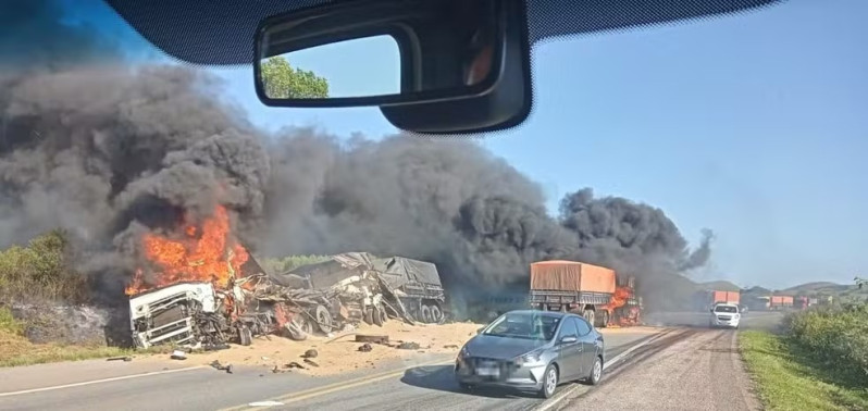 Dois caminhões pegam fogo e motoristas morrem após colisão frontal