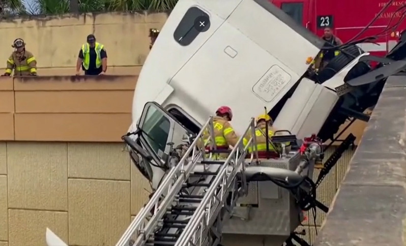 Cabine de caminhão fica pendurada em viaduto, e motorista é resgatado