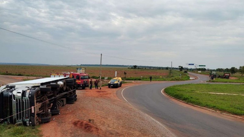 Caminhão carregado de carne tomba em rodovia do MS