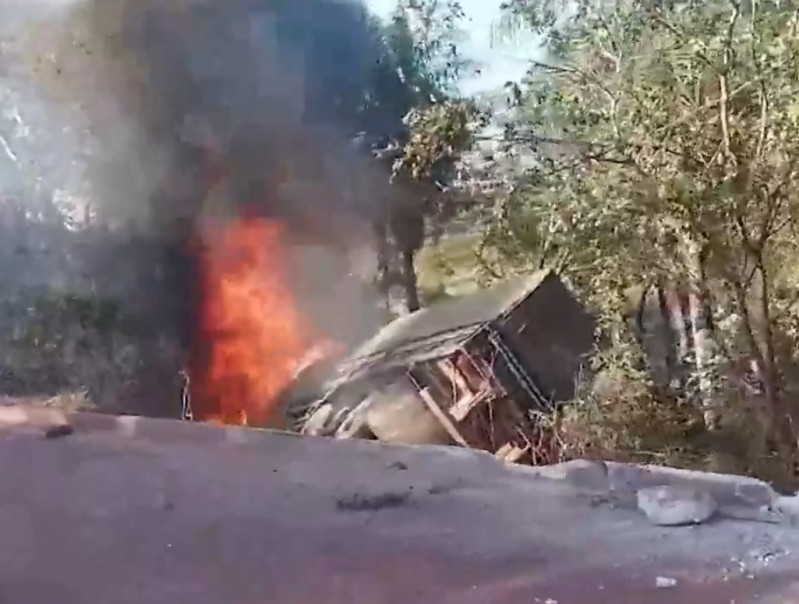 Motorista perde controle e carreta pega fogo ao cair em barranco