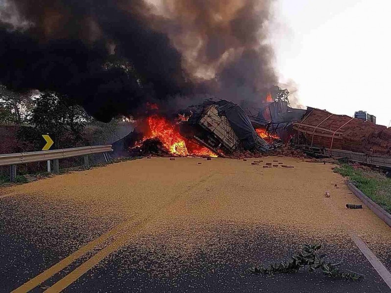 Acidente com três carretas acaba com veículos incendiados