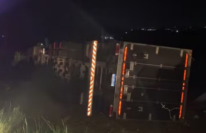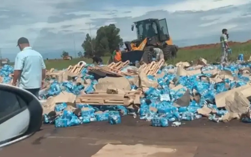 Caminhão carregado com cerveja tomba na BR-463, próximo a Ponta Porã