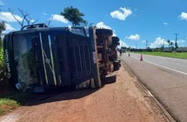 Caminhão carregado com algodão tomba na BR-163 em MS