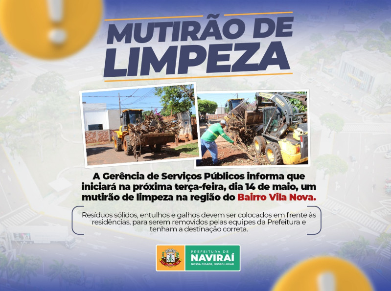 Prefeitura de Naviraí iniciará mutirão de limpeza na próxima terça na região do Vila Nova