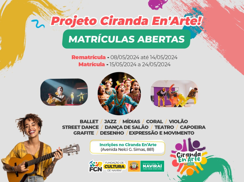Projeto Ciranda En'Arte da Prefeitura de Naviraí recebe matrículas até o dia 24 de maio