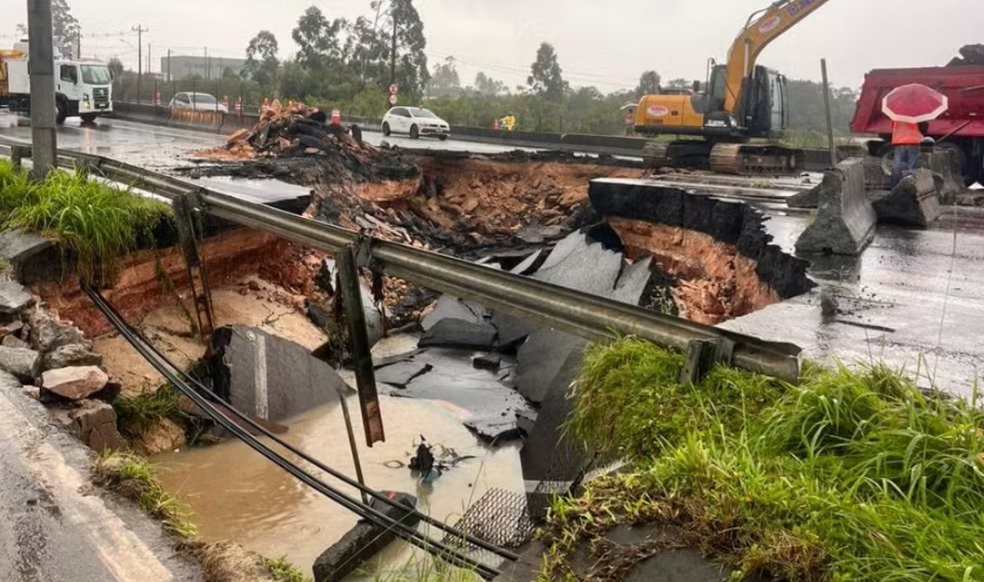 Cratera se forma na BR-101 após fortes chuvas em Santa Catarina e trecho é interditado