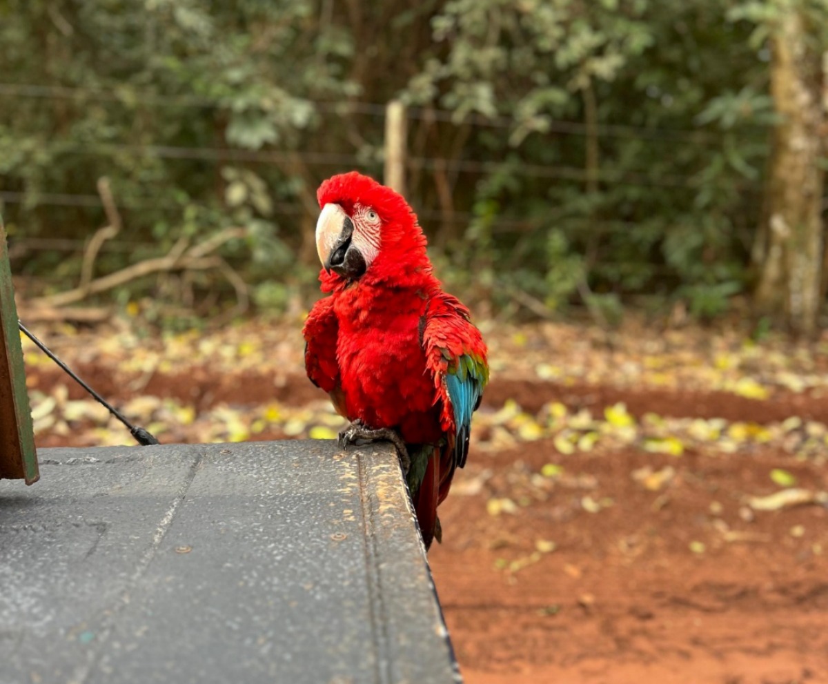 Arara-vermelha é resgatada pela PMA após colisão com vidraça em Dourados