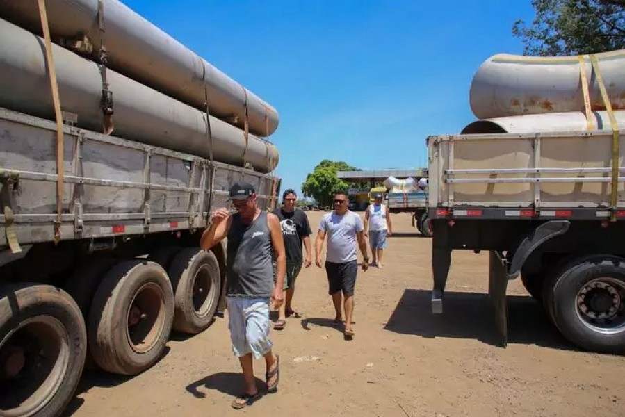 Motoristas de caminhão que trabalham para a Suzano, carregando infraestrutura da construção da fábrica (Foto: Paulo Francis)