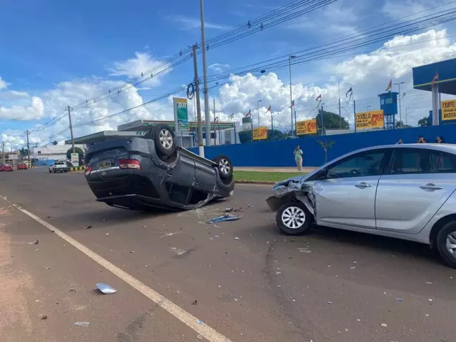 Mulher de 69 anos tentou atravessar a Avenida Gunter Hans com um HB20 sedan e bateu em uma Hilux SW4, que seguia em direção ao Hospital do Pênfigo. A colisão aconteceu na tarde deste sábado (13). Com o impacto, o SUV acabou capotando na via.