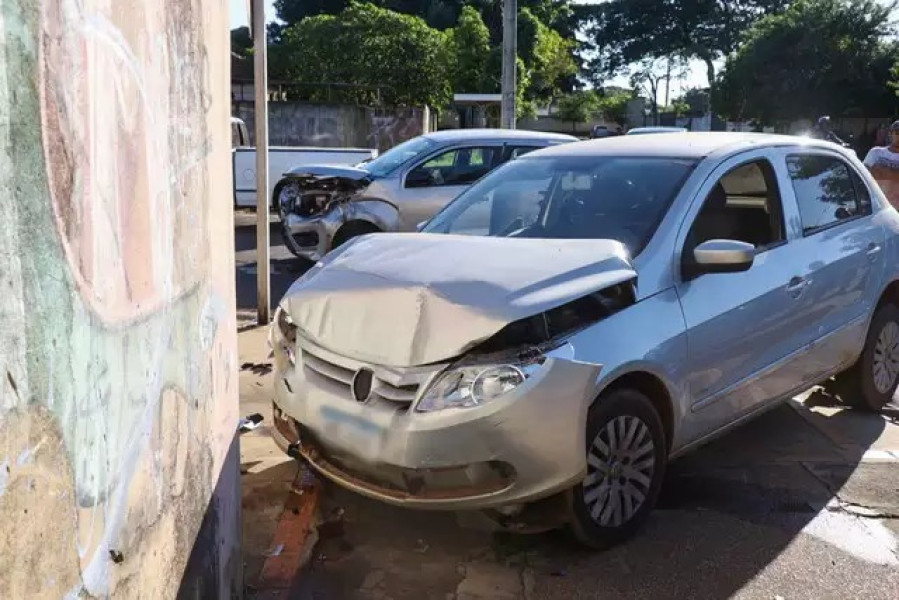 Carro bateu em um muro em acidente envolvendo outros dois veículos, na manhã desta sexta-feira (3), na Rua João Pedro Pedrossian com Albert Sabin, na Vila Taveirópolis, em Campo Grande. A motorista de um dos veículos ainda tentou fugir, mas foi detida por um policial civil à paisana.