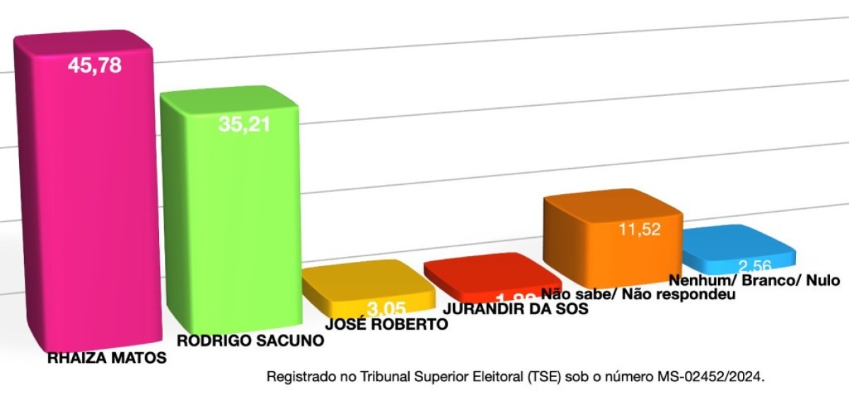 Com a apresentação de uma lista de candidatos, Rhaiza Matos consolida sua liderança, com 45,78% das intenções de voto. Rodrigo Sacuno permanece em segundo lugar, com 35,21%, enquanto José Roberto tem 3,05%, e Jurandir da SOS, 1,88%. Neste cenário, 11,52% dos eleitores não souberam ou preferiram não responder, e 2,56% indicaram que votariam em branco, nulo ou em nenhum dos candidatos.