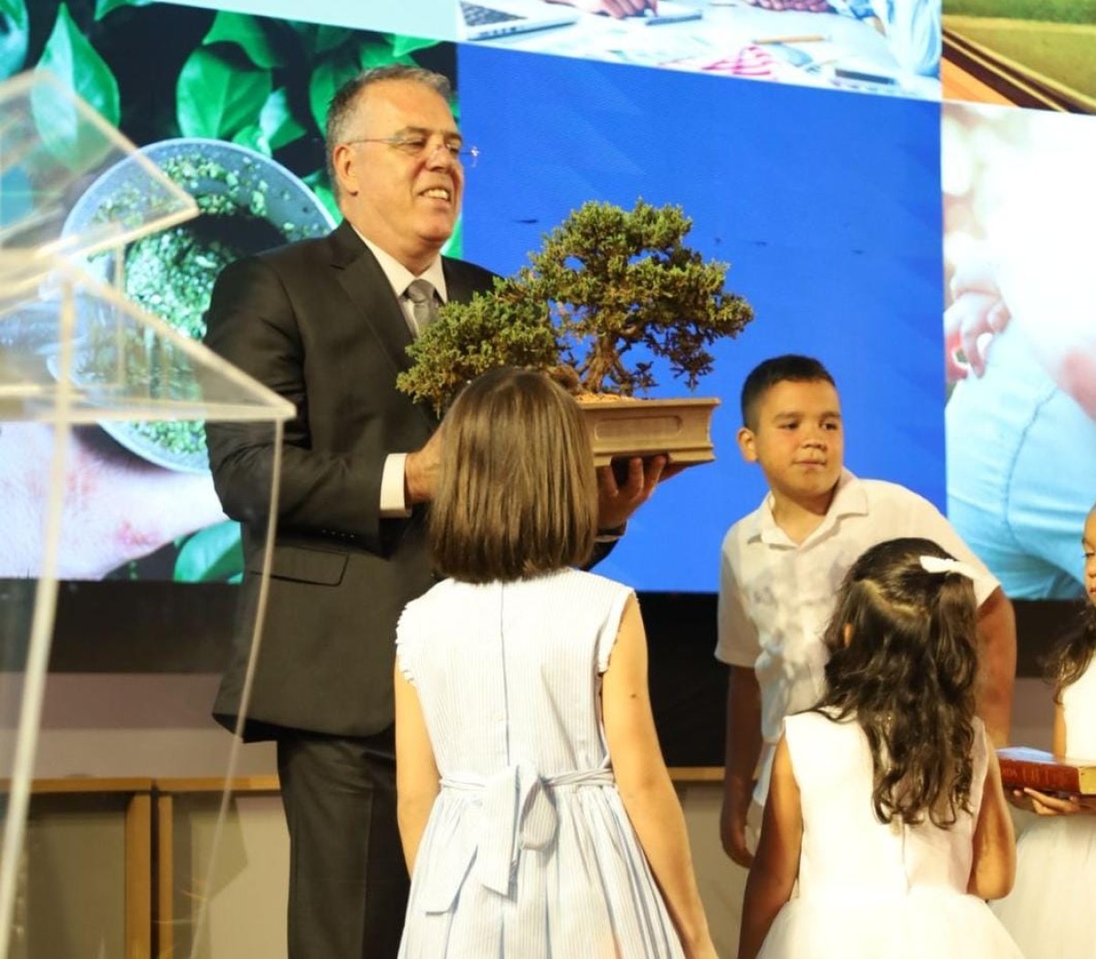 Fechando as apresentações, um grupo de crianças conduziu o prefeito Eduardo Campos ao palco para receber uma árvore, um bonsai, símbolo do vigor e da vitalidade da administração que ora inicia, juntamente com uma Bíblia, a Palavra de Deus para guiar o mandato e iluminar as decisões.