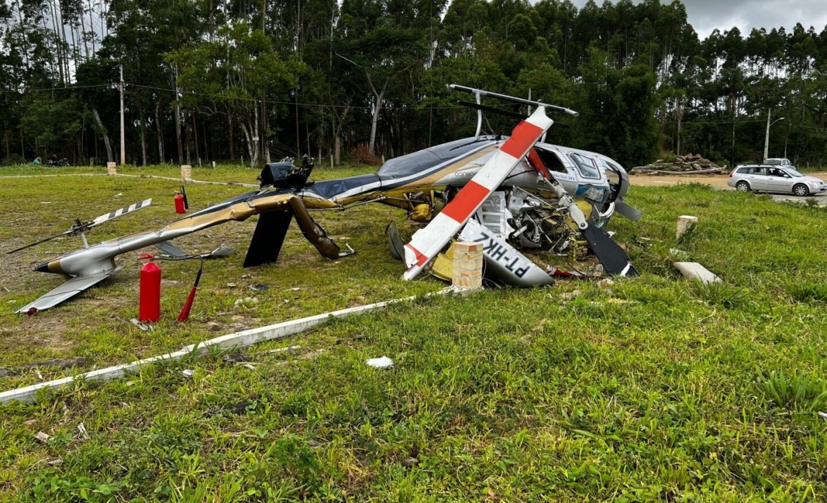 Um helicóptero com cinco pessoas caiu neste sábado (4) em Penha, no Litoral Norte de Santa Catarina. O acidente aconteceu por volta das 14h, e as causas ainda estão sendo investigadas. A aeronave caiu em um canteiro às margens da SC-414, na Rodovia Transbeto, e imagens mostram o helicóptero bastante danificado após o impacto.