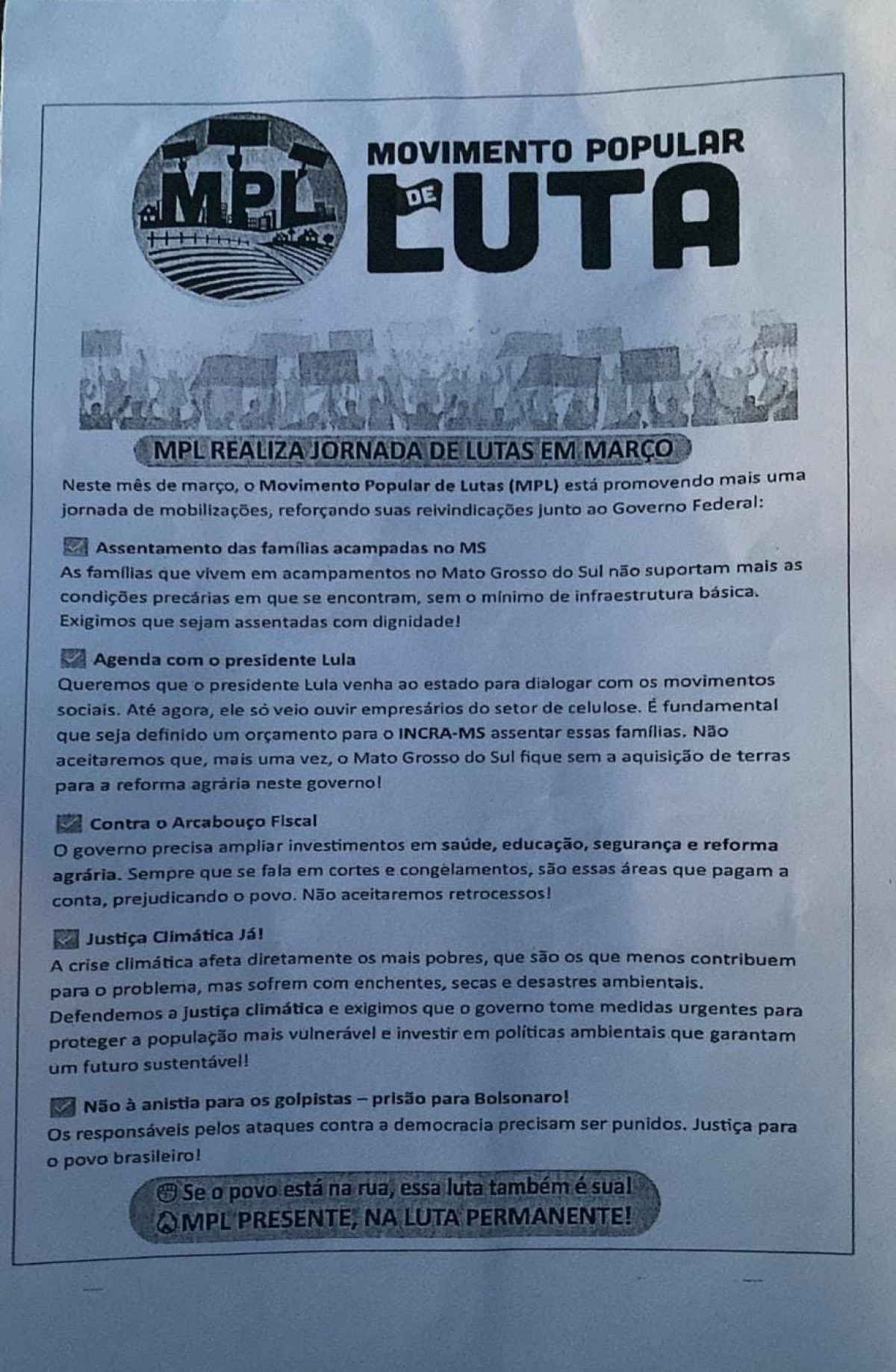 Os manifestantes reivindicam ao Ministério Público Federal (MPF) a liberação de vistorias pelo Instituto Nacional de Colonização e Reforma Agrária (INCRA) em áreas da União no município. Segundo o movimento, o bloqueio burocrático impede a regularização de terras e o avanço de processos de reforma agrária na região.
