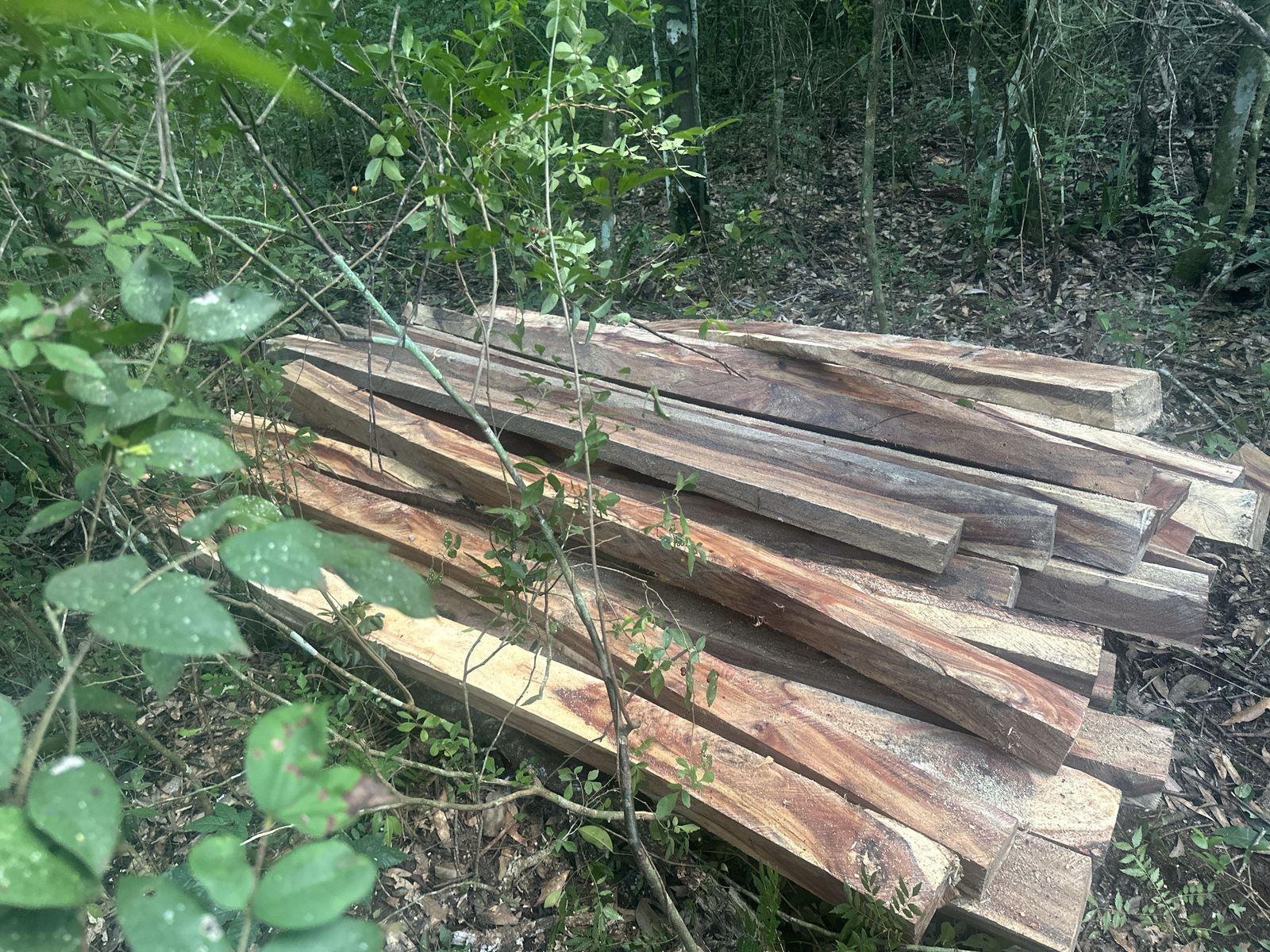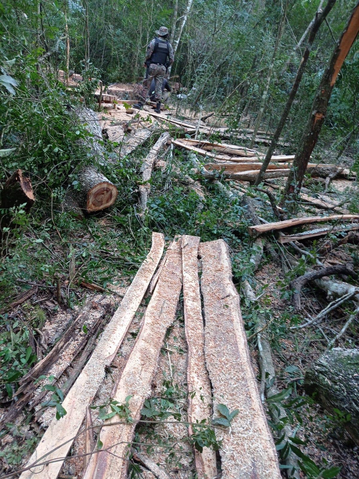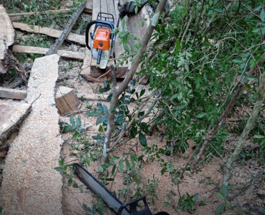 No local, os policiais do 2º Batalhão da PMA encontraram os suspeitos utilizando duas motosserras sem registro e sem a Licença de Porte e Uso (LPU), exigida por lei. Eles realizavam o corte seletivo de árvores sem qualquer autorização ambiental. Aproximadamente um metro cúbico de madeira extraída ilegalmente também foi apreendido.