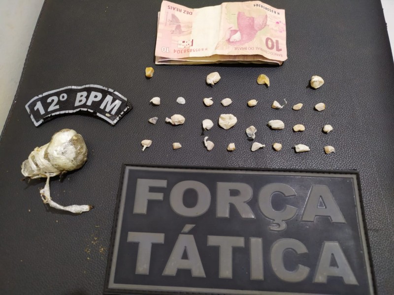 Foi feita busca minuciosa no interior do imóvel, onde foram encontradas, enterradas, 27 (vinte e sete) pedras de crack, totalizando 4g (quatro gramas). Os envolvidos foram questionados sobre a procedência da droga, porém ninguém se manifestou.