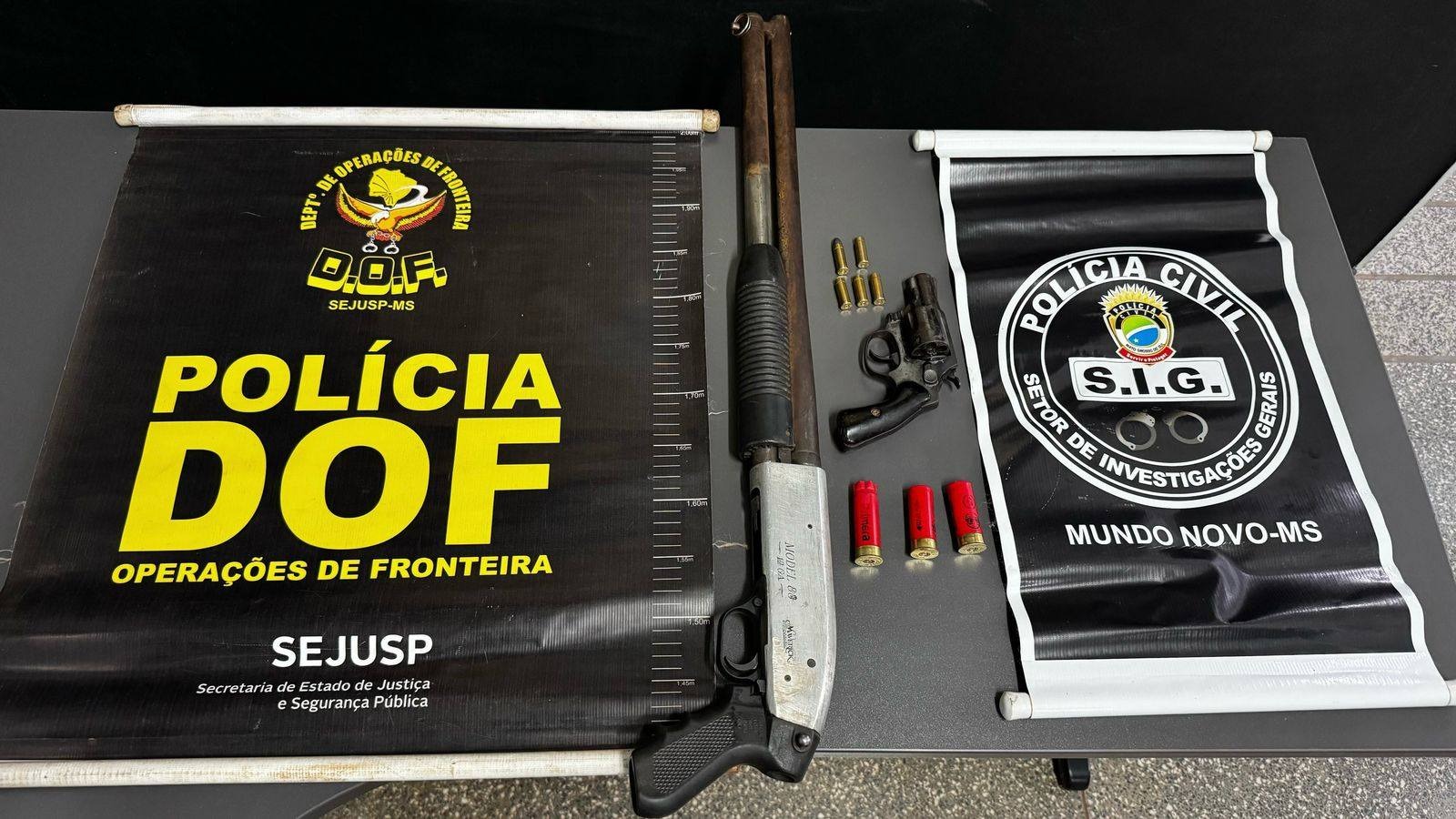 Armas e munições apreendidas com os suspeitos mortos durante confronto em Mundo Novo; ação conjunta envolveu o DOF e a Polícia Civil (SIG). Foto: DOF/PCMS.