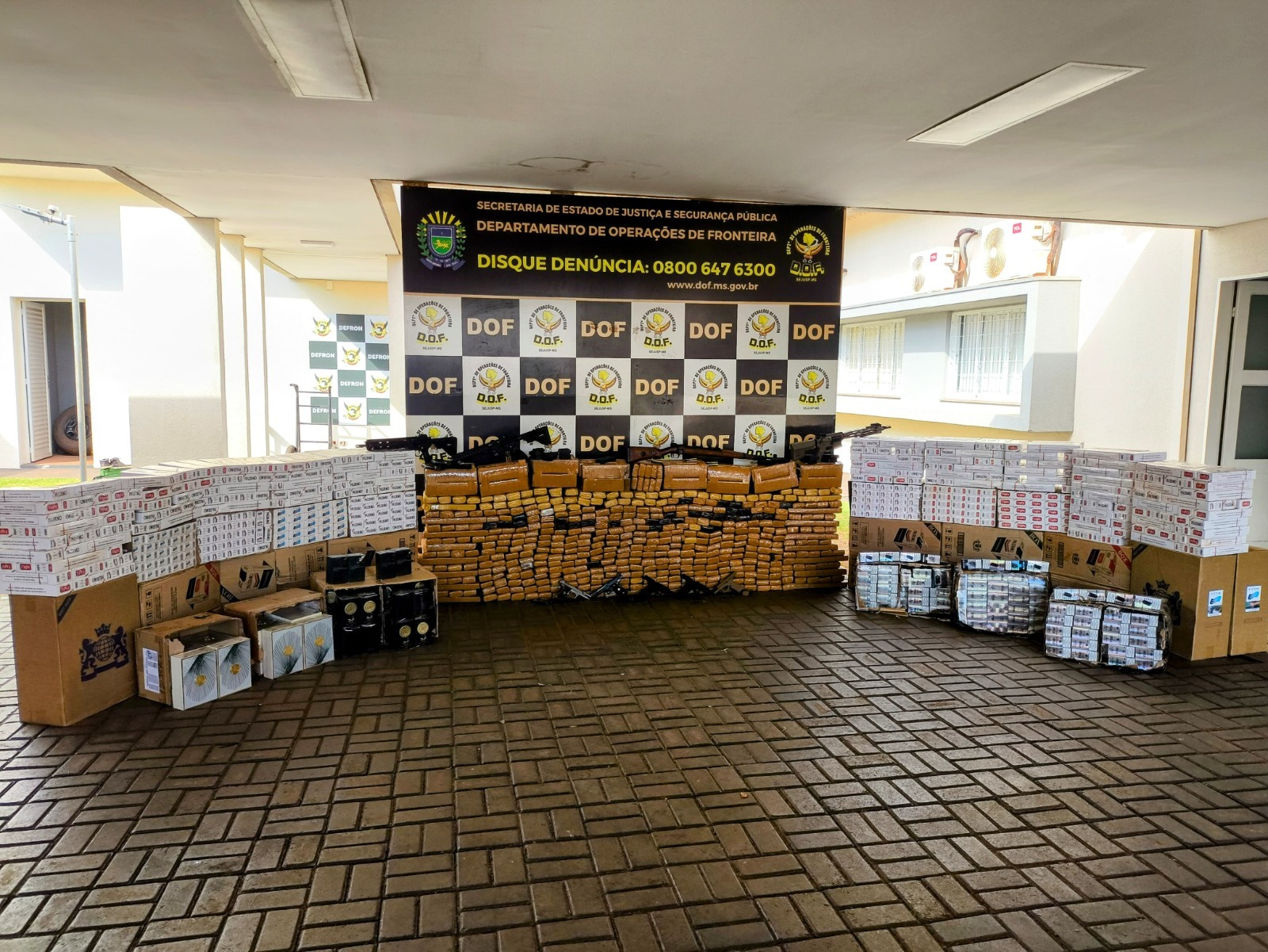 O Departamento de Operações de Fronteira (DOF) apreendeu na manhã desta quinta-feira (24), em Ponta Porã, um comboio formado por quatro veículos carregados com drogas e materiais contrabandeados do Paraguai. A ação, realizada no Assentamento Corona, área rural do município, resultou na apreensão de maconha, cigarros eletrônicos, perfumes, pneus e armas de airsoft, além da prisão dos envolvidos.