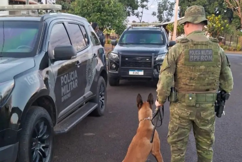 Policial do BPFron conduz cão farejador durante operação Sinergia em Pérola; ação contou com apoio de equipes da Polícia Militar, Rotam e Rone (Foto: Divulgação/Polícia Civil).