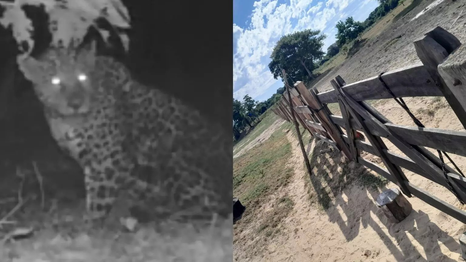 Onça na fazenda, à espreita — vigilante e silenciosa — registrada pela própria vítima na fazenda (Imagens: Reprodução/Redes Sociais).