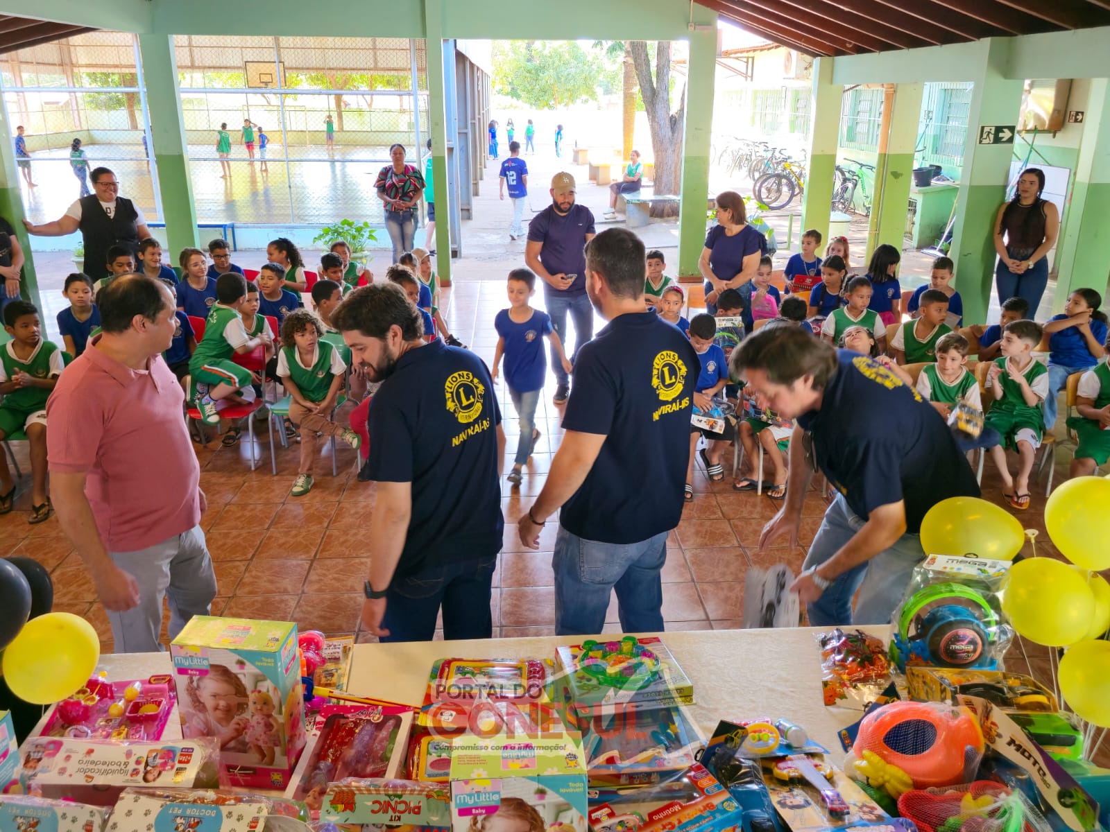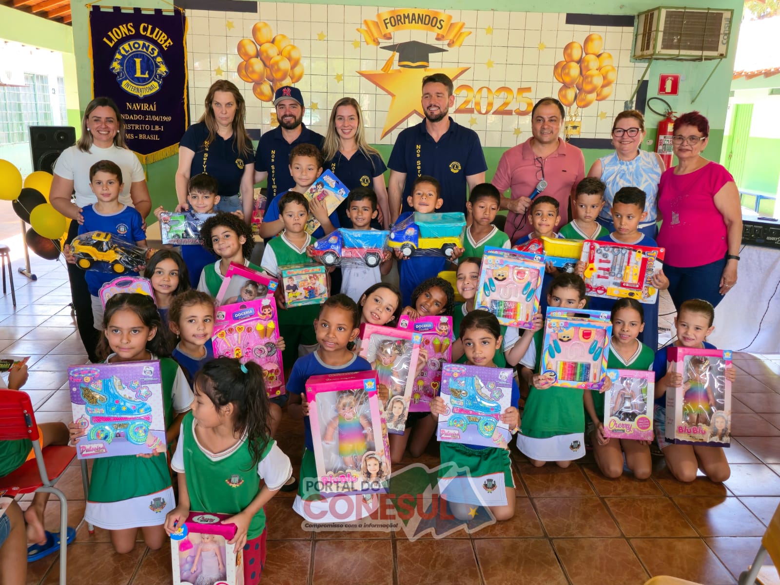 O Lions Clube de Naviraí promoveu, nesta quinta-feira (28), mais uma edição de sua tradicional ação de fim de ano, entregando brinquedos para os alunos da Escola Municipal Professor Milton Dias Porto. A iniciativa, conduzida por leoninos e domadoras do clube, beneficiou 131 crianças de 7 e 8 anos, nos períodos matutino e vespertino, com brinquedos novos e de excelente qualidade.