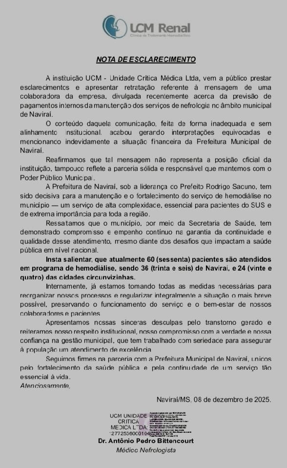 Diante da repercussão, a UCM publicou uma nota de esclarecimento reafirmando sua parceria com o município e pedindo desculpas pelos transtornos causados. A instituição destacou a contribuição decisiva da administração municipal para garantir a continuidade do serviço de hemodiálise, considerado essencial e de alta complexidade, atendendo pacientes de Naviraí e de cidades vizinhas.