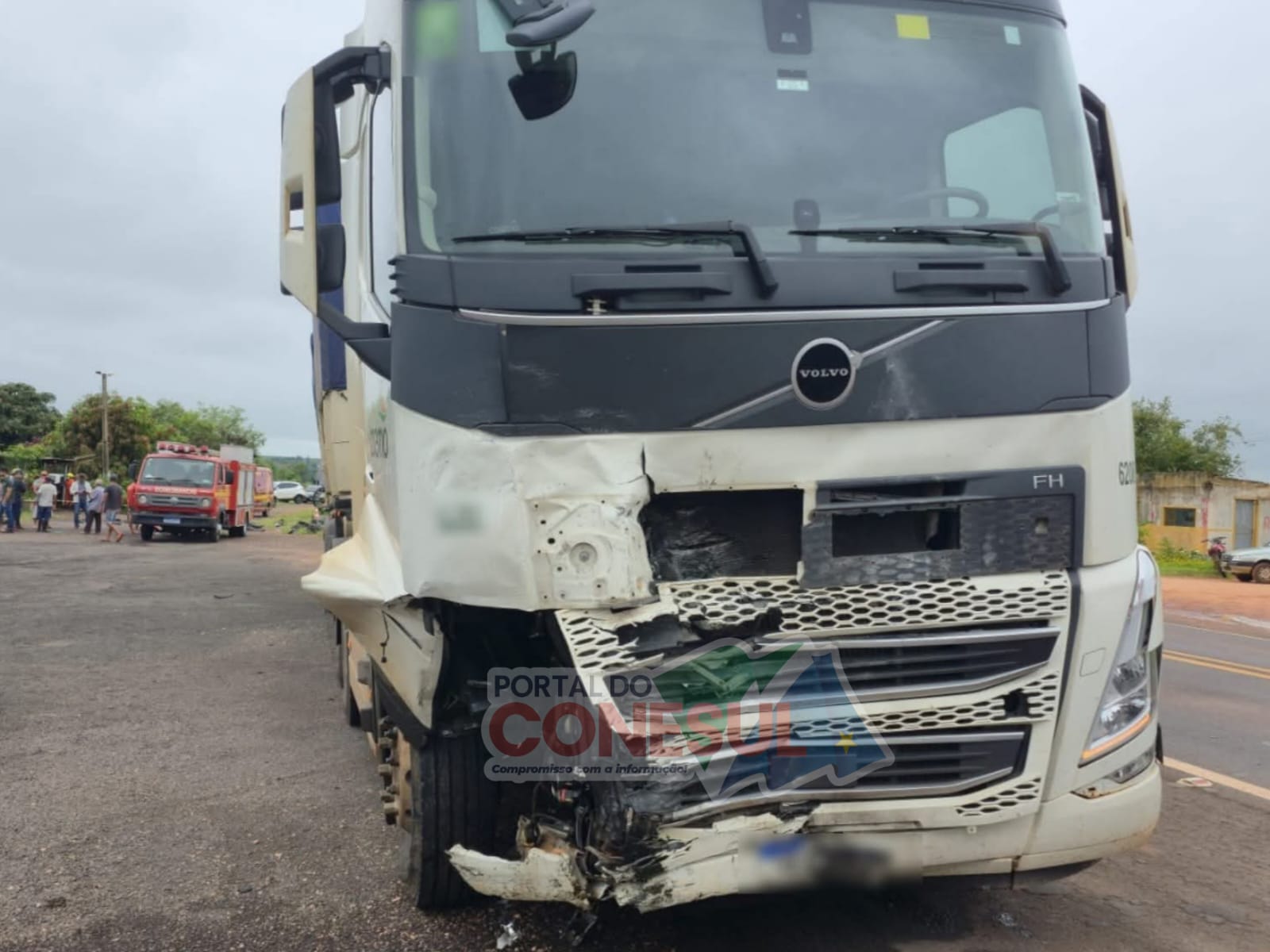 Caminhão Volvo envolvido em acidente na BR-487, com danos visíveis na parte frontal. Equipes de resgate e autoridades estão no local. (Foto: José Luiz Bressa Portal do Conisul)
