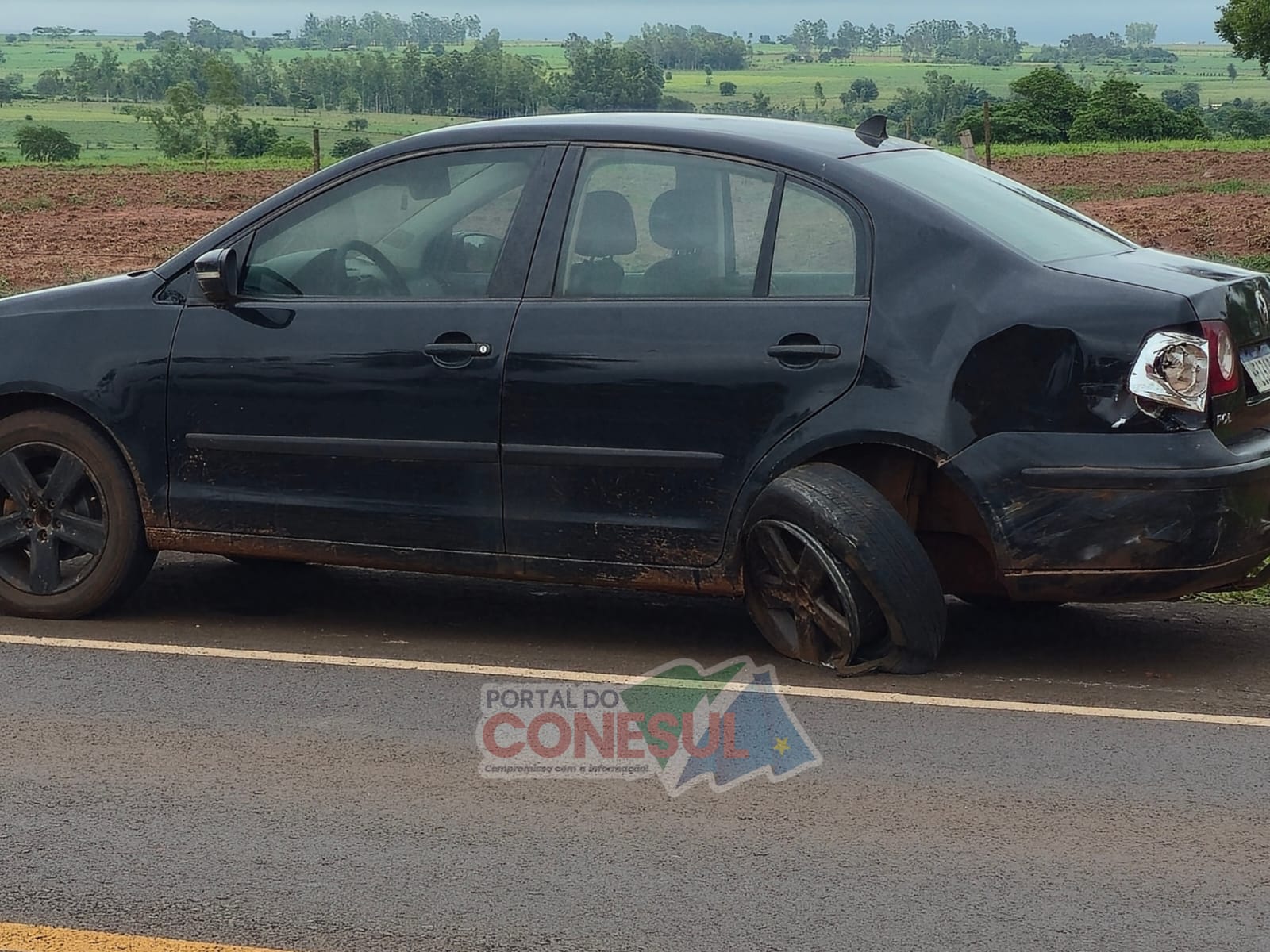 Veículo Volkswagen com danos na parte traseira e pneu danificado após acidente na BR-487. (Foto: José Luiz Bressa Portal do Conisul)