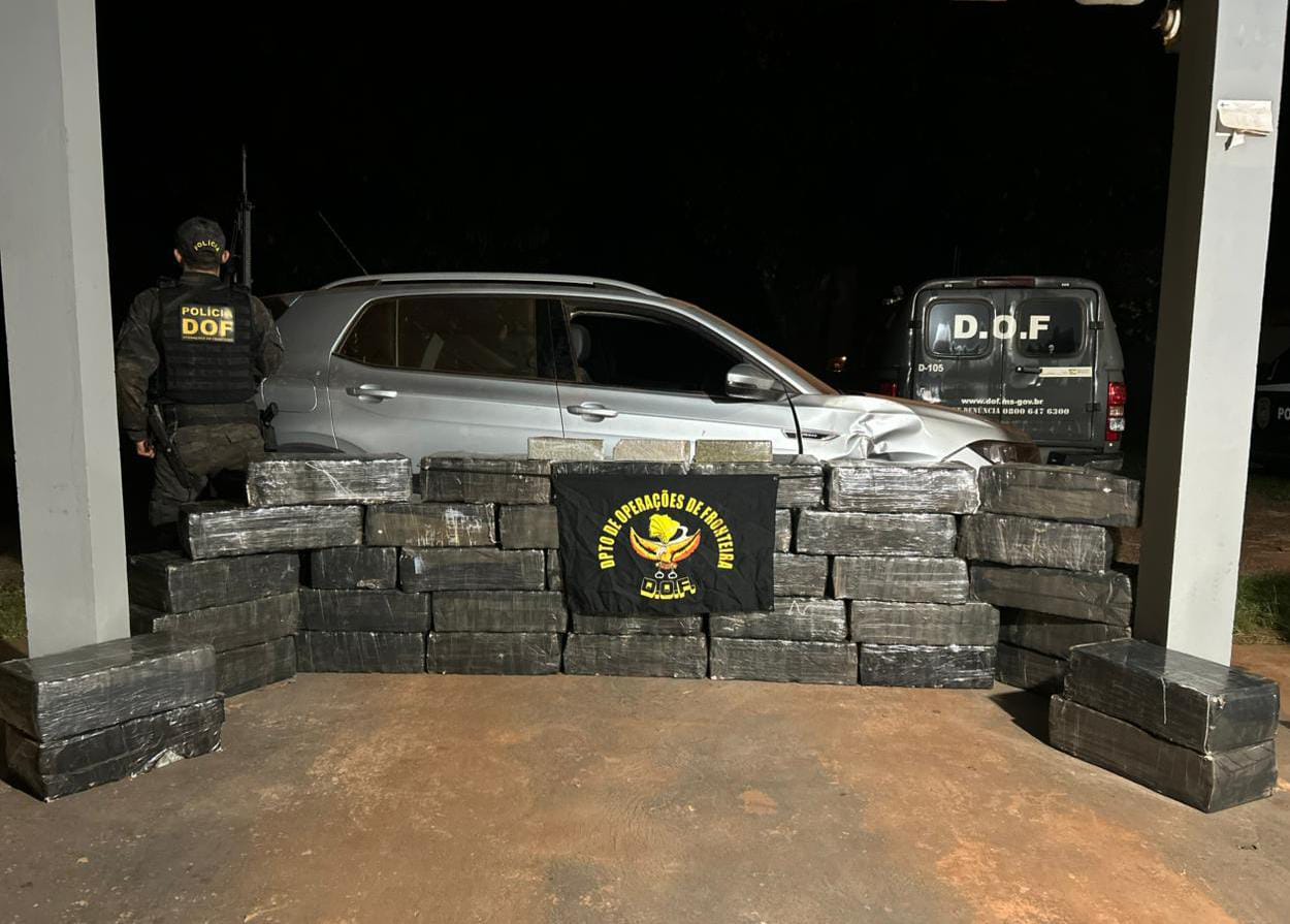 No interior do automóvel, foram encontrados diversos fardos do entorpecente. Na verificação veicular, foi constatado que o veículo utilizava placas falsas.