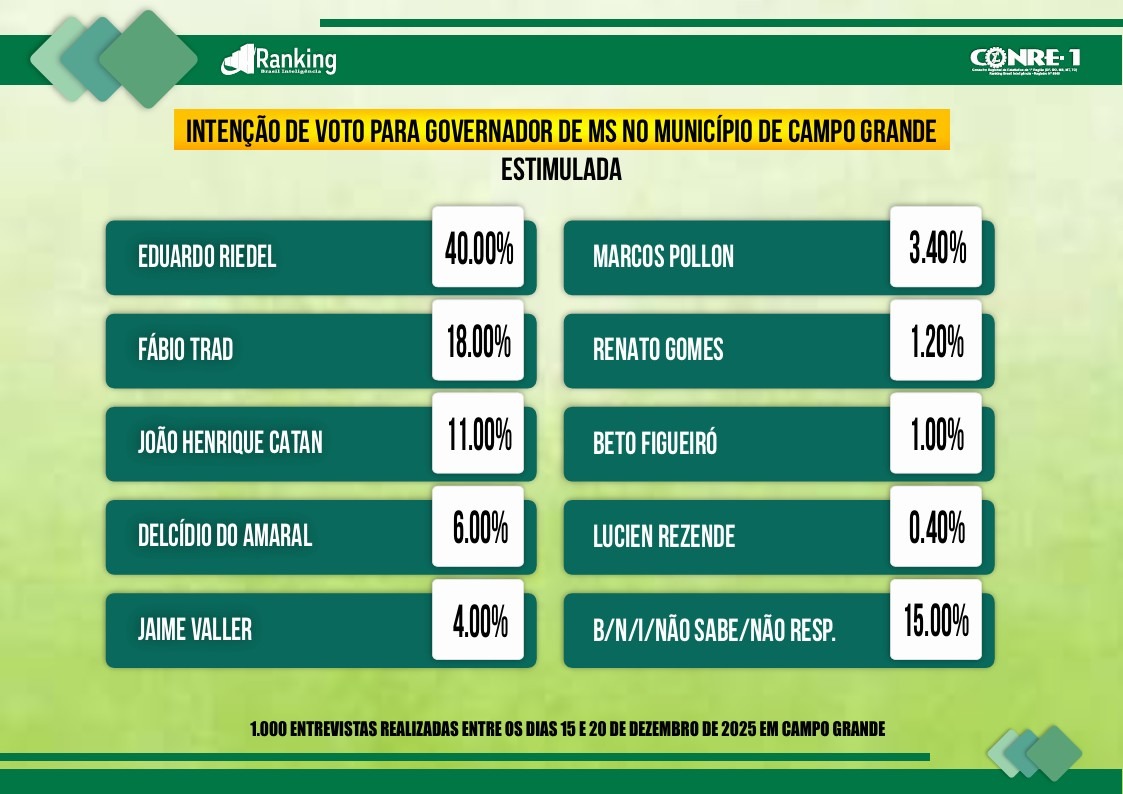 Campo Grande (MS) – A Capital sul-mato-grossense tem protagonizado um cenário político próprio na corrida pelo Governo do Estado. Pesquisa do Instituto Ranking Brasil Inteligência, divulgada nesta semana, aponta o governador Eduardo Riedel (PP) na liderança isolada entre os eleitores campo-grandenses, com 40% das intenções de voto na modalidade estimulada, consolidando uma vantagem que, segundo analistas, reforça o peso estratégico da cidade na disputa de 2026.