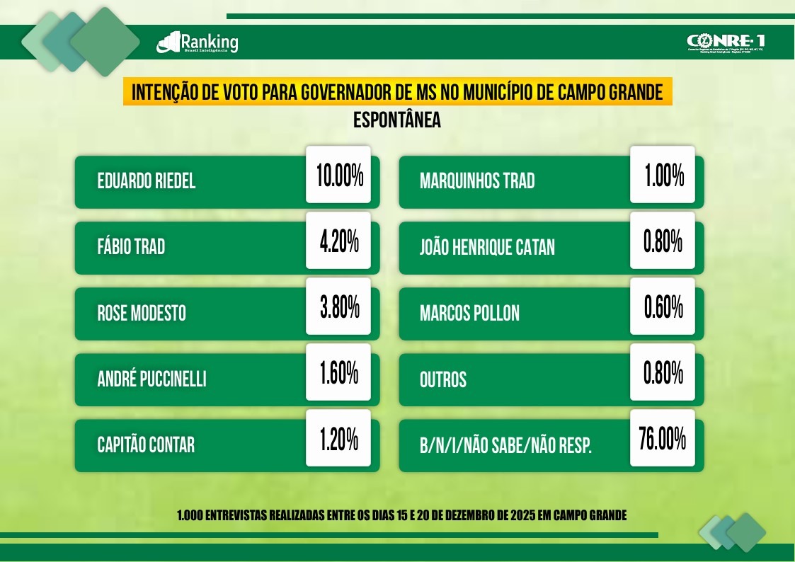 Na pesquisa espontânea, quando não há apresentação de nomes, Riedel é novamente o mais lembrado (10%), seguido por Fábio Trad (4,2%) e Rose Modesto (União Brasil), 3,8%. André Puccinelli (MDB) aparece com 1,6%, Capitão Contar, 1,2%, Marquinhos Trad (PDT), 1%, João Henrique Catan, 0,8%, e Marcos Pollon, 0,6%. A maioria esmagadora do eleitorado da Capital, no entanto, ainda não associa a disputa a nenhum nome: 76% declararam nulos, brancos ou indecisos nessa modalidade.