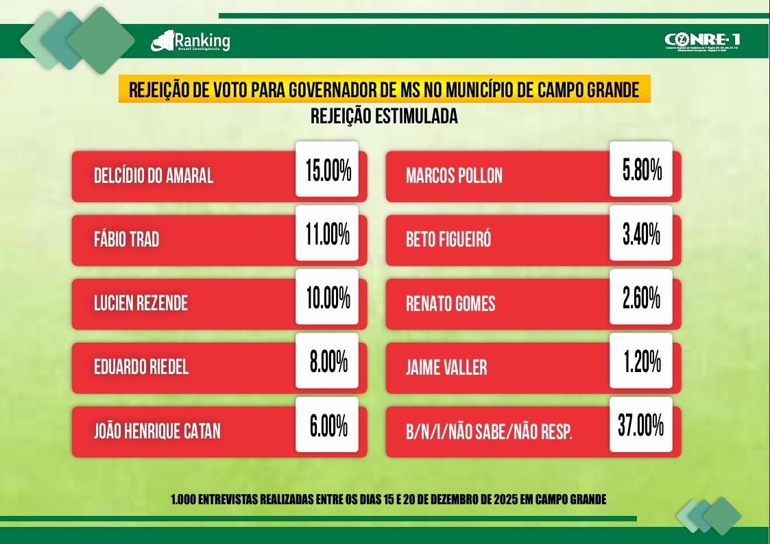 O estudo também mensurou rejeição eleitoral – e o retrato não é menos revelador. O ex-senador Delcídio do Amaral, cassado em 2016, lidera o índice de nomes “em que o eleitor não votaria de jeito nenhum”, citado por 15% dos entrevistados. Em seguida aparecem Fábio Trad (11%) e Lucien Rezende (10%). Riedel, apesar da liderança, registra 8% de rejeição, seguido por João Henrique Catan (6%), Marcos Pollon (5,8%), Beto Figueiró (3,4%), Renato Gomes (2,6%) e Jaime Valler (1,2%). Brancos, nulos ou eleitores que preferiram não opinar somaram 37%.