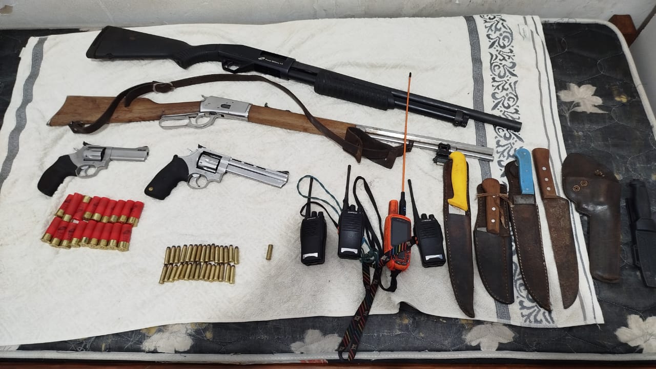 Armas, munições e facas apreendidas durante a operação de combate à caça ilegal em Juti (MS), com a participação da Polícia Militar e Polícia Ambiental. Foto: Divulgação PMA/PMMS.