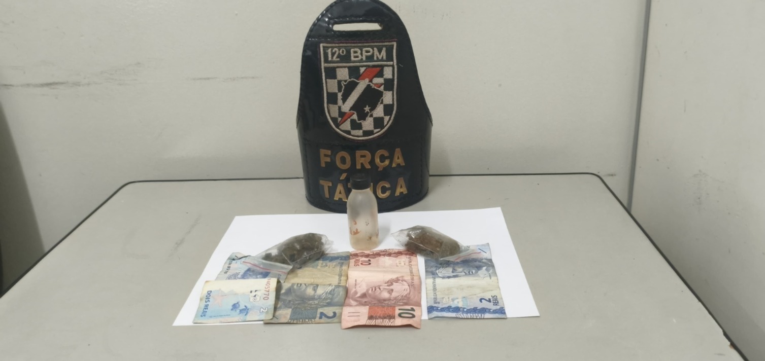A abordagem foi realizada imediatamente. Na revista pessoal, os policiais encontraram uma quantia em dinheiro e porções de substâncias entorpecentes no bolso de um dos suspeitos. Foram apreendidas duas porções de substância análoga à maconha e quatro pedras de substância análoga ao crack.