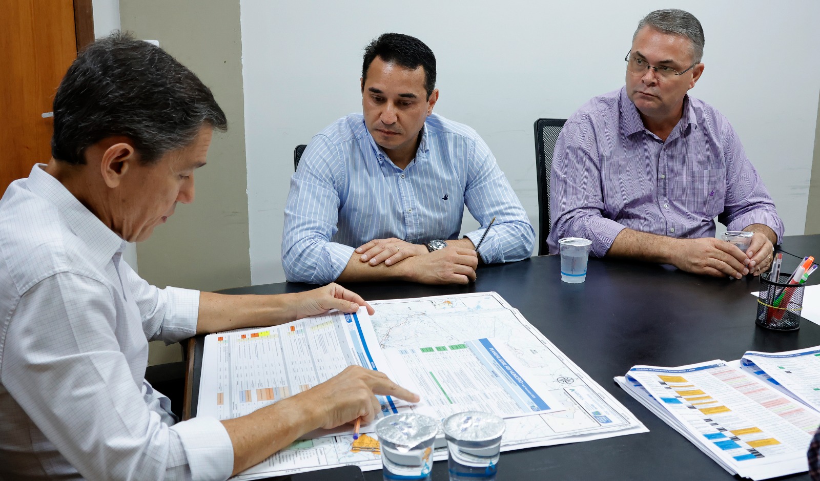 Prefeito Rodrigo Sacuno analisa projetos de infraestrutura ao lado de equipe técnica do Governo do Estado, durante reunião para tratar das obras de recuperação da malha viária em Naviraí. Foto: Ribeiro