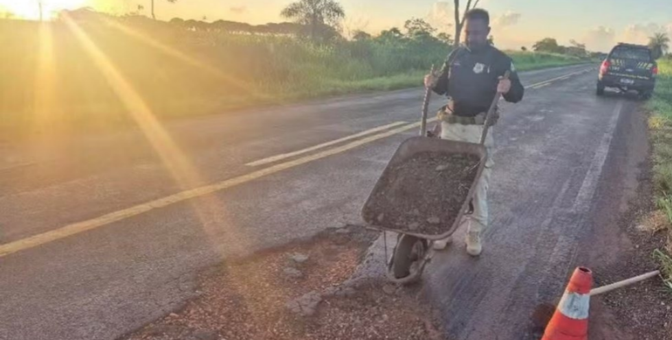 Após danos a veículos, PRF realiza reparo emergencial em buracos da BR-376 em MS