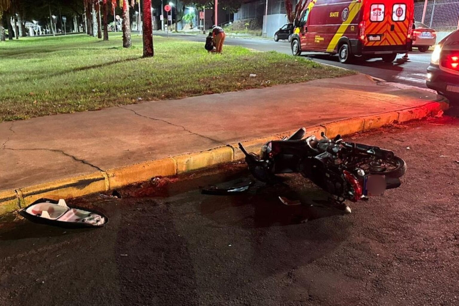 Motociclista fica gravemente ferida em acidente entre carro e moto durante a madrugada de domingo (8).