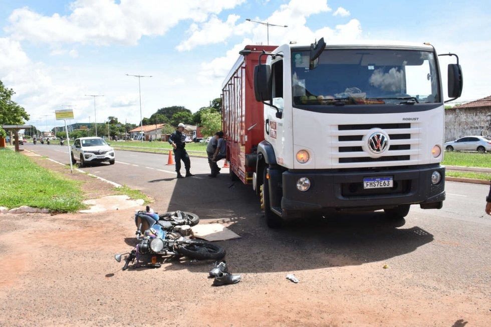 Motociclista fica ferido após colisão com caminhão em cruzamento de Campo Grande